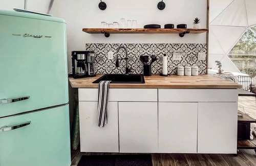Each of our domes offer luxurious accommodations, AC & heaters, private bathrooms and are built on an individual private decks. Inside you'll find a well appointed kitchenette with a coffee makers, a toaster, a hot plate, microwave, and mini or mid-size fridges, along with most of the related cooking tools. No ovens. A small dining table for 2 and additional seating space to lounge out. Outside you will find BBQ grills, fire pits, a relaxing hot tub and comfortable seating to take in the views. We also provide yoga mats, assorted board games, 2 robes, toiletries, a hair dryer, coffee, tea and sugar.