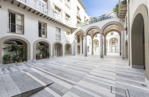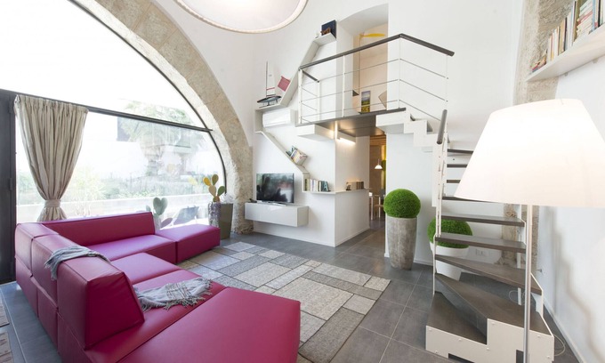 The loft is located in the Palazzo Tomasi di Lampedusa, historical residence of the namesake author of “The Leopard". The apartment has been obtained by the restoration of two old warehouses with their original stone arches and has been furnished in collaboration with the famous Italian studio LAGO Design. The loft houses a bright living room of 110 square metres with ceilings 6 metres high, and a large window that allows visual continuity between indoor spaces and the private terrace with the common garden. In the living room, guests will enjoy a large, red leather corner sofa, a workstation and peculiar bookshelves all around the walls. The independent kitchen has a unique design and is totally equipped with an induction hob, a dishwasher and a coffee machine, in addition to a dining area. Through a particular staircase made of wood and steel, guests can reach the mezzanine floor which houses a bright bedroom with a large round bed, boasting the hanging lamp Blow by Artemide and an ensuite bathroom with shower. Another bathroom with shower completes the accommodation, together with comforts such as free Wi-Fi, air conditioning and heating.