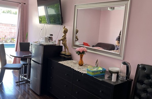 Studio like unit with queen size bed, 2 nightstands, big dresser with mirror, reclining leather sofa, round dining table, mini fridge, microwave, toaster, electric kettle,2 chairs , 55’’ LED TV with attached Amazon fire stick and antenna big closet with built in organizer, ceiling fan and luxury private bathroom .Pool view.
