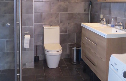 On the ground floor you will find a comfortable, spacious bathroom with rain shower, vanity unit and a toilet. There is also a washing machine.