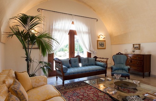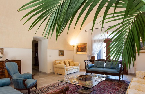 Fabulous holiday villa, embraced by a well-kept park of about 20,000 square meters, embellished by the large pool and designed with heart and intelligence by the friendly and experienced owners. The elegant residence, rises from the restructuring of a nineteenth-century villa, built in the area "cold lands", in the town of Galatina (about 15 minutes drive from the sea and close to many typical attractions of Salento). Numerous and comfortable interiors, exceptional furnishings and layout: 5 bright bedrooms, 6 excellent bathrooms, 3 charming living rooms, large kitchen with central island. Let's see the composition in detail. A characteristic dry stone wall joins the Lecce stone of the main entrance, where an automatic gate in wrought iron is supported by two imposing columns. The long driveway, bordered by trees and ornamental plants (lantana, cicas, dwarf palms, etc.), accompanies you to the monumental building on two spacious floors. The valuable property has 7 doors and windows to access the different rooms on the ground floor. From the entrances in front, depending on the point of view, you are able to see the rear doors, thus the garden and pool. Both lead through the bright and elegant furnished rooms. The central access leads to a room with a bookcase in the middle of the two spaces described above. This room, with non doors, is in the middle of the house and separates both parts giving a pleasant feeling of freedom with open spaces to live and to appreciate. The entire ground floor is well-designed and gives you enough space to enjoy the classic and historical house. The second living room is on the left hand side of the dining area and kitchen. We note a big lounge with a stone fireplace, TV and a colorful Persian rug. Another open space with vaulted ceiling is fitted with a pool table. This pool table can be transformed into a big dining table with space for up to 22 guests. The dining area between kitchen and the second living room is placed in front of the big glass door which gives you not only access to the terrace and the pool area, but also gives you and enchanting view on the rear garden. The big and well-equipped kitchen with dishwasher, an espresso machine, a fridge with freezer and a comfortable central island with seats, a sink and various storage units gives you the opportunity to cook and bake for all your gustiest or family. From the billiard you can pass through the entrance hall with the bookcase to access leads the bright and antique furnished living room. This room is decorated with beautiful furnishings, paintings and a crystal table set on a lively Persian artifact. Also, on the ground floor there is a double bedroom, with an independent exit to the garden with a bathroom with a shower and toilet en suite. Still, on the ground floor we have a second large bathroom with artistic stone sink and toilet. To the left of the pool table a staircase leads up to the first floor. Once up the stairs we have on the left side the laundry room (with washing machine, sink, iron and ironing board). Thorough the next door on the left you enter the master bedroom with a large bathroom with shower and toilet en suite. Leaving this first bedroom we enter a nice living room with sofas and 60" Television which separates all 4 bedrooms. The master bedroom has a double bed and a marble bathroom with bath and toilet en suite. Each bedroom has a doubled and its own full bathroom and is equipped with the latest generation TV. The elegant villa also amazes for its aesthetic sense and practicality in the organization of outdoor spaces. Coming out on the back of the villa a wonderful infinity pool, bordered by precious trani stone, allows a comfortable bathing in the lower part (1 mt deep) or refreshing dives in the deeper section (about 2mt). Alongside various areas for pleasant moments of relaxation we have a circular jasmine magpie, with table and chairs which is a delight to the eyes during the flowering period. On the other side there is a spacious and particular Veranda bordered by solid columns equipped with a dining table, chairs and even a sink. The sunbathing areas with umbrellas and deck chairs where you can enjoy a drink or get a tan in the warm Apulian sun are all around the pool. There is a small bathroom and two outdoor showers near the pool. Last but not the least there is the feature that makes the estate even more unique than it already is: is the presence of an inestimable archaeological treasure; the church of "Santa Maria della Porta". This Church was built in ancient times. Traditional stories recount that the holy Saint Peter passed from here on his journey to the place of his martyrdom. For the curious ones of you, we suggest reading into it. Googling the "Church of Santa Maria della Porta Galatina" will give you a lot of hits to stories etc. There are certainly a lot of valuable details of this wonderful home which we might have forgotten to tell, but it should be a real pleasure for your to find out all about it when staying in this dream villa for your special holidays. This Villa was used to shoot a video of the well-known Salento music group "Apres la classe". You can watch it on YouTube looking for "Apres la classe el presidente" (mainly outdoor spaces, swimming pool and crypt of Santa Maria) are represented here.
