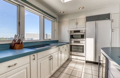 Also included are two master suites, newly installed 3 stop elevator (transport chair accessible), kitchen with upgraded stainless steel appliances, 3-stop dumbwaiter, 7 flat screen TVs, whole house sound system. Enjoy any of 4 decks with ocean views, one offering complete shade. Unwind in the hot tub, enjoy a sun-filled ocean view breakfast off the kitchen and experience 360 degree breath-taking vistas of ocean and bay from the roof top. Garage and parking for eight vehicles.