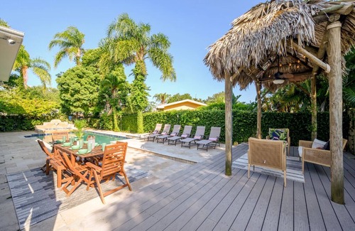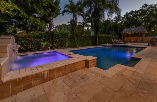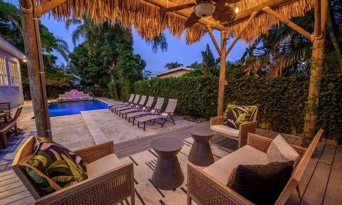 ✅ Beautiful outdoor area with pool, hot tub, tiki hut covered seating, BBQ grill, and outdoor dining seating up to 8