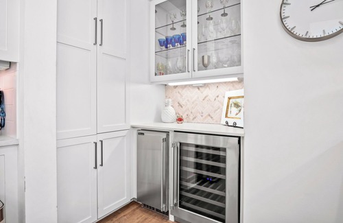 MAIN LIVING: The second floor living space boasts golden accents that highlight this home’s relaxing name—Golden Daze! Sink into the extra large upholstered sectional or arm chairs that bring everyone together in the Family Room, while the well-designed chef’s kitchen has everything the cook in the group might need—even plenty of space for wine in the wet bar with ice maker and wine fridge.