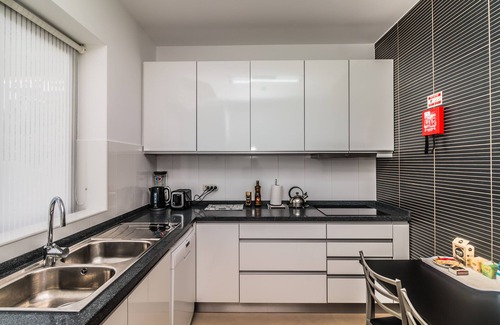 The kitchen is fully equipped, and it also has a laundry room with a washing machine and a clothing iron.