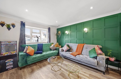Entrance lobby leads to a comfortable living room equipped with two large sofas, a 55 inch smart TV and an arcade machine to keep the kids (and adults!) entertained.