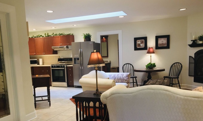 Propane fireplace, cozy living room and dining room with cherry wood floors, 2 TV's and stereo.