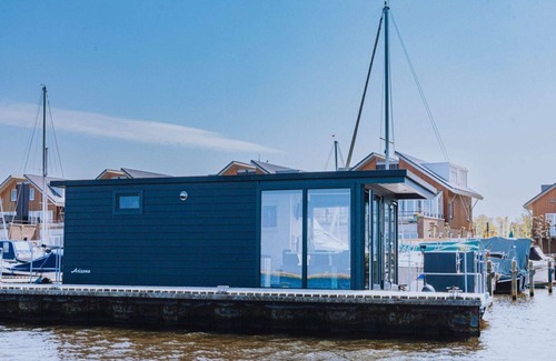 Wake up to the gentle sway of the water and uninterrupted views of the Uitgeestermeer from your private harbour lodge. Moored at the end of the marina for maximum tranquility, this modern houseboat offers a serene escape with the added comfort of air conditioning and stylish furnishings. Large windows let the sunlight pour in, while the inviting terrace is the perfect place to sip your morning coffee or enjoy sunset drinks.