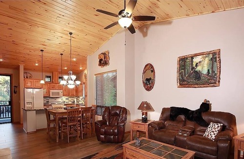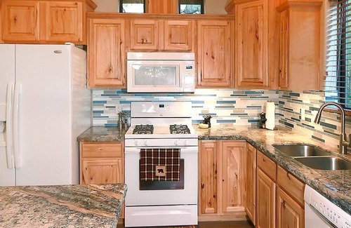 The kitchen is fully stocked, has beautiful granite countertops, and all the essentials of home. The living room includes high-end furnishings and large screen HD Smart TV to include Roku, cable and high-speed internet. The natural gas fireplace in the main living area provides warmth and ambience during the cool evenings.