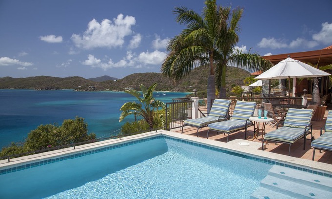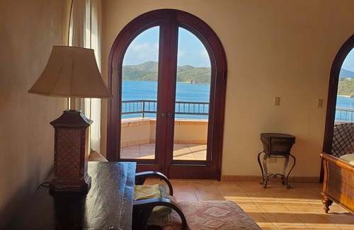 Casa Cielo is a private villa located on Long Point Peninsula in the 'less traveled' East End of St. John. This ridgeline location offers 270 degree views from 2,000 square feet of decks, patios and lanais. Coral Bay, where you will find restaurants and shopping, is a 15 minute drive thru the National Park’s Hurricane Hole. Casa Cielo is a spacious, well-appointed, private 4-bedroom luxury villa with breathtaking views of the sea, the animals, the boats, and the beaches that make the East End of St. John such a unique and relaxing spot. Enjoy your morning's first cup of coffee on the expansive lower patio, watching sea turtles come up for air in the crystal blue waters of Hansen Bay. Catch sight of dolphins and sometimes even migrating whales as you lounge by the large in-ground pool or soak in the spa. Each of the Villa's 4 bedrooms have a luxurious queen size bed, seating area, full bath, large closet, ceiling fan, AC and outdoor patio. One bedroom has a kitchenette, a covered lanai and an outdoor shower. The primary bedroom suite may be reserved for parties of 7-8 guests or for an added fee. The great room is outfitted with a 4K Smart HDTV, shelves full of board games and books, and comfy seating for all. A fully equipped kitchen makes preparing and serving meals easy . There is no better spot on the island to enjoy the tropical sights and sounds unique to St. John than Casa Cielo. Come to the East End for your next vacation and find a little piece of paradise waiting for you. PLEASE SEE CASA CIELO’S PUBLISHED RATES ON THE RATE PAGE UNDER NOTES FOR PARTIES ABOVE FOUR GUESTS ‘INSTANT QUOTE’ IS INACCURATE. FOURTH BEDROOM AND BATHROOM IS AVAILABLE FOR PARTIES OF SEVEN-EIGHT GUESTS OR FOR AN ADDITIONAL FEE. Keywords: private, family, villa, ocean views, close to beach, secluded, pool, hot tub, large decks, amenities, 4 bedrooms, WIFI, internet, gourmet kitchen, easy parking, Casa Cielo, Villa Casa Cielo