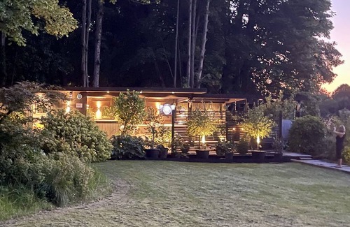 Luxury Lodge set in woodlands, overlooking open field. Covered outdoor seating with TV (outdoor TV only March to October), own patio area. Note: this lodge is set within large grounds of main family home. Private parking and self checkin available. Close to Clifton village and short journey to Bristol city centre.