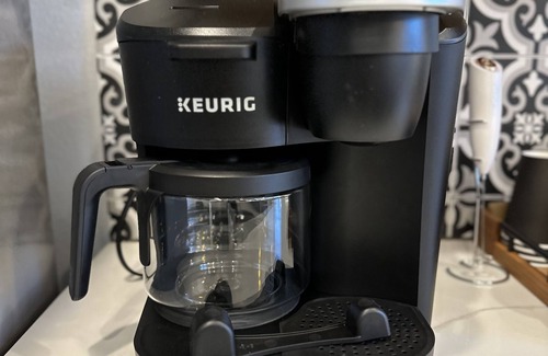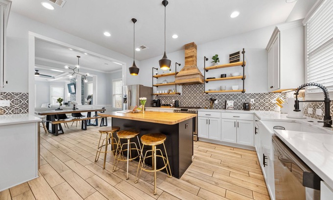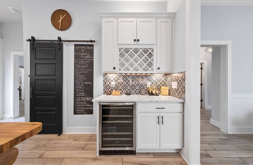 🌟Kitchen- Has stainless steel appliances, quartz countertops and butcher block island. It is fully stocked with all new cookware and cutlery for any chef. There is also a wine fridge and coffee bar equipped with a brand new Keurig coffee maker.