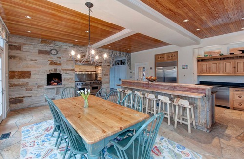 The large kitchen and dining room boasts a wood-burning fireplace and giant gas stove, as well as double dishwashers and sinks. The kitchen opens onto a wraparound porch and outdoor eating area with gas grill.