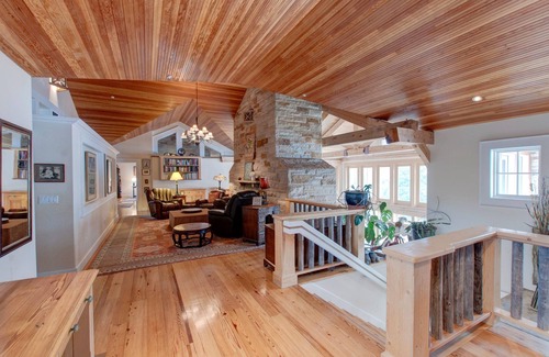 The master suite has a private whirlpool bathtub and fireplace. Three queen suites with forested views each have their own full bath. Additionally there are two triple-bunk rooms and an open area downstairs for families to customize to best meet your needs with 2 queen beds and 2 twin beds. This area can be closed off or divided with curtains.