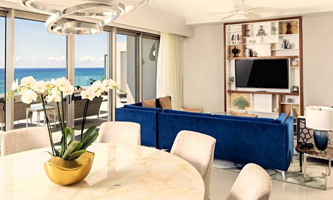 As you walk in, you will notice a stunning gourmet kitchen with breakfast bar complete with upscale appliances, a dining area that seats 8, and a living room with an entertainment center, a sleek 55-inch flat screen TV, two plush sofas and two lounge chairs with the geometry of coral. An open floor plan flows out to an expansive wraparound terrace with an ocean-facing jacuzzi and plenty of room for relaxation.