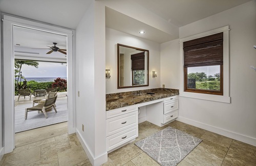 Aloha Suite (Master) is on the second floor. It includes an ocean front, furnished covered lanai with a full size hot tub overlooking the ocean. The King Size Tempur Pedic bed faces the azure blue waves. 2 full bathrooms his and hers on each side of the Master with oversized walk in closets.