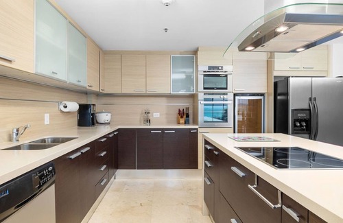 The designer kitchen is a chef’s dream, equipped with a refrigerator/freezer with water dispenser, dishwasher, microwave, oven, stovetop, coffee maker, toaster, blender, and tea kettle—everything you need to prepare meals or cocktails to enjoy on your private balcony.