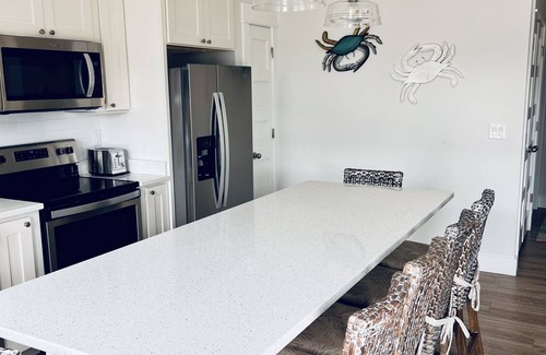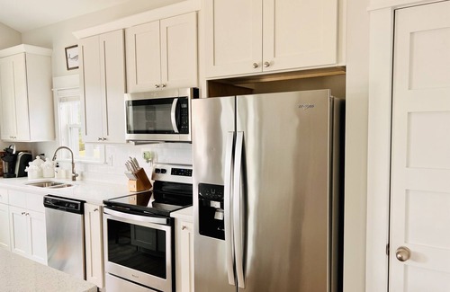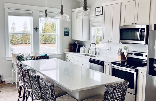 The fully equipped kitchen boasts stainless steel appliances, sparkling quartz countertops, and a grand island to seat 6. Grab your morning cup of joe with an easy to use Keurig, relax on the front patio and enjoy the fresh air, cook on your private gas grill, while the children run around the large grassy field, and rinse off after a day at the beach with your private outdoor shower.