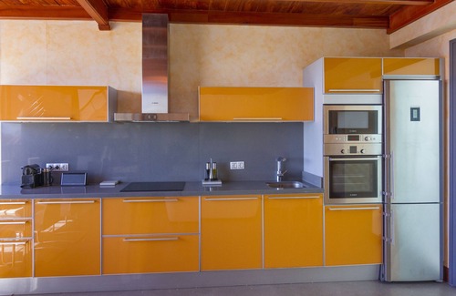 On the first level the huge open-plan lounge/kitchen/diner opens out onto a large roof terrace. The kitchen is equipped with top-of-the-range appliances including a Bosch induction stove, large Liebherr fridge/freezer Bosch dishwasher and washing machine/dryer. The lounge area has two large leather sofas and there is a flat screen TV with a host of channels in Spanish, English and German.