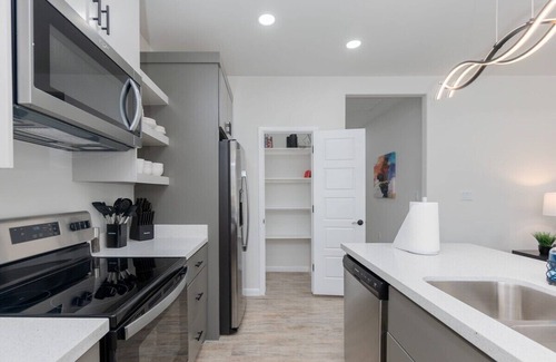 Make your way to the modern kitchen, which comes fully equipped with stainless steel appliances, a coffee bar, sleek stone countertops, open shelving and everything you could need to whip up a delicious meal.