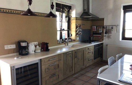 The kitchen with rural look is equipped with a Smeg gas cooker with oven. There is also a microwave oven with grill and all other kitchen utensils such as coffee maker, kettle and blender. The villa has a separate utility room with washer and dryer and large fridge freezer.
