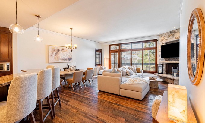 Living Room: The living room features mountain decor with hardwood flooring, creating a cozy and welcoming ambiance. You'll find comfortable modern sofa, a gas fireplace, and a 65” smart TV. You will also find some board games for some indoor fun. Enjoy some fresh air out on the private balcony that overlooks the communal outdoor spaces, the ski run and chairlift, and views of the mountain.