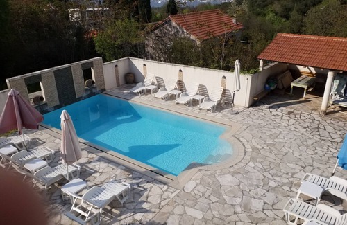 South west facing Villa Mandelina is a luxury spacious stone farmhouse restored by the owners (who also own Villa Maslina) to make a fabulous holiday Villa. Spread over three stories each room is unique in design and furnishing with parts of the building dating back 300 years. The bedrooms have been furnished with comfortable beds and all the rooms are very spacious with their own bathrooms. The kitchen is properly equipped ( not at all like a holiday let) and has a big American fridge freezer, oven and hob plus lots of cupboards and work space.A huge dining table seats 12 with views over Tivat bay and the seperate sitting room has Sat TV , books and games and big squashy sofas. It is a great place for groups of friends or large families with 3 bedrooms having a private courtyard and 3 on the top floor. The huge contemporary living space has terraces which overlook the private flat deck pool (8 meters x 4 meters) and the sea. The pool is surrounded by sun terraces for all day sun bathing plus umbrellas for shade. Overlooking the pool is a shaded terrace which has a great bar for those cool drinks, BBQ and table seating 14.. A games room has table tennis , darts and ball games. Secure parking for 5 cars and a large garden add to the sense of space. A footpath leads down to the beach (15 min walk approx ) and the shops and beaches are 5 mins by car.