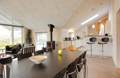 Layout: Kitchen(cooker(electric), coffee machine, microwave, dishwasher, fridge, freezer(60-99L)), Living/bed room(TV(german television channels, danish TV channels (DR1 and TV2), norvegian TV channels , swedish TV channels)), bedroom(double bed), bedroom(2x single bed), bedroom(2x single bed), bedroom(2x single bed), bedroom(double bed, children's bed, high chair), bathroom(tumble dryer, washbasin, shower, toilet, washing machine), bathroom(washbasin, shower, toilet), mezzanine(4x single folding bed), Bubble bath(indoor, heated, 6 persons), sauna(indoor, 6 persons), heating(electric), terrace, garden furniture, sun loungers, swimming pool(indoor), play equipment, table tennis table, darts, billiards, fish cleaning table, geothermal energy