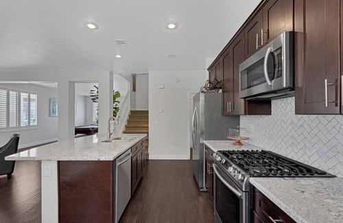 This home is located just minutes from Downtown Summerlin, hiking in Red Rock Canyon, and a short drive to the Las Vegas Strip. The property features four king size beds, a movie room, open kitchen and game area with a pool table. The backyard is completely contained and dining is available on the patio. This home has satellite TV, Netflix, Hulu and high speed internet. Eight guests can enjoy comfortably, so please inquire before booking if you traveling with more than the recommend occupancy.
