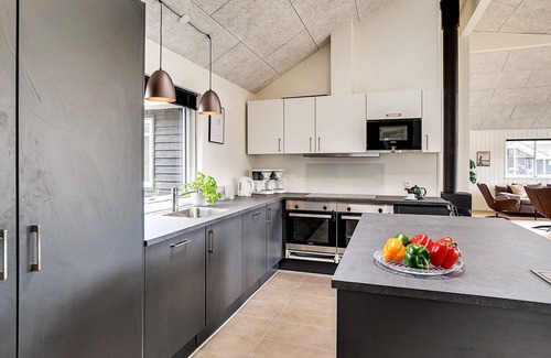 This well-equipped holiday cottage at Houstrup Strand has an impressive pool area with an 18 m² large pool with slide, counter-current system and a 4-6 people whirlpool as well as a sauna for 4 persons. On the other side of the centrally located dining/living room you will find the activity room where you can have a drink or play darts, billiards, table tennis, table football or just observe the others playing. There is also a sofa area with TV with PlayStation4 for many hours of entertainment. The living room is tastefully furnished with comfortable furniture and a wood-burning stove as well as a large flatscreen TV with various channels. The house is very spacious and well-dimensioned and built around 2 separate sleeping areas with a bathroom. There is also a large mezzanine with 4 beds and plenty of room. The obvious room for the family to meet is the large and architecturally interesting combined living room and kitchen. The kitchen is fully equipped with e.g. 2 ovens and 2 dish washers in order for more people to help preparing dinner. There is a large, partially covered terrace where you can enjoy the Danish summer. On the large, surrounding plot there are swings and a sandpit as well as a trampoline (usage at own risk/insurance). No letting to youth groups.