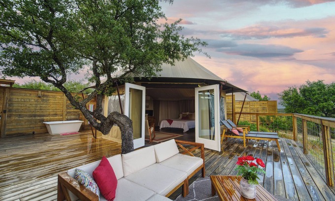 Luxury Safari Tent #2 Scenic Hill Country Views- Private Deck/Hot Tub/Pond Pool | Cabin in Marble Falls