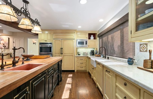 No details were missed in the farmhouse kitchen, great for larger groups or families. A chef's dream with double Wolf ovens, Wolf 4 burner gas cook top with griddle, SubZero refrigerator, KitchenAid dishwasher, and freezer/refrigerator drawers. There is seating for 20 between our two large dining rooms. The kitchen is fully equipped with all kitchen utensils and gadgets you will need to cook meals for your friends and family!