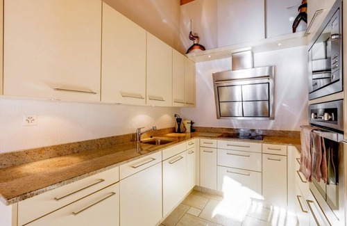 The apartment can comfortably sleep 7 people across 3 bedrooms. The master bedroom has a king size bed, TV and DVD player, and an ensuite shower room. The second bedroom has 3 single beds; 2 of which can be set up as a double. The third bedroom has 2 single beds, which can also be configured as a double. All of the bedrooms have ample cupboard space, mountain views, and balcony access. There is a fully tiled family bathroom with spacious corner bath and shower.