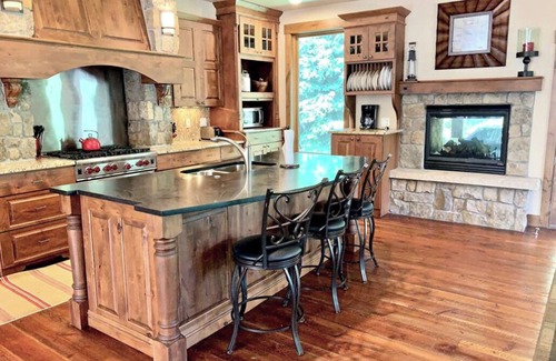 Our home has it all: 4 spacious bedrooms (2 master bedrooms with California king beds, one queen bed bedroom, one bunk bed bedroom (twin over twin with a trundle and a sofa bed) , 4 1/2 bath (being 3 full bathrooms and one half bathroom), 2 living room areas, a gourmet kitchen with high end appliances (professional 6-burner Wolff stove, large Sub-zero refrigerator), plenty of counter space and a large island with seats for 3 people in an open floor-plan. The kitchen's two-way fireplace overlooks the back porch with a large grill and private hot tub.
