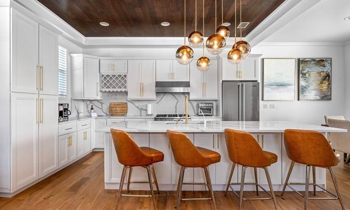 3 large bedrooms, high ceilings, open floor plan with chef's style kitchen, large dining area, and 65" TV. Private backyard, patio & 2 car garage.