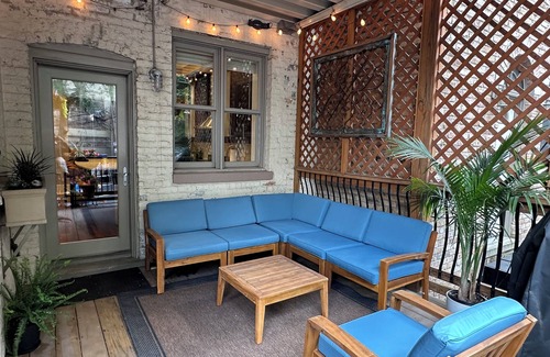 The home encompasses the first floor and lower garden level of the building. The unit has it’s own entrance from the charming front porch with a vestibule. The family room and dining room face the street where you can read a book or watch the 55” flat screen TV as you enjoy the fire and watch the world go by out the large front window decorated with period stained glass. Also on the main floor are the primary bedroom with king bed, extra large walk-in master closet and primary bath which features a large shower and a soaking tub, along with dual sinks. There is a 1/2 bath in the hallway of the main floor, and finally, the gourmet kitchen with large island, gas range, dishwasher, microwave and large refrigerator. Off the kitchen, enjoy the comfort and quiet of the covered back deck with its large sectional couch and gas grill.