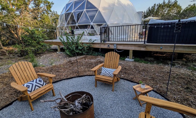 Explore, luxuriate and relax at an otherworldly stargazing adventure in our stunning & private 685-square-foot glamping Geodome. It is nestled in the middle of the secluded Texas woodlands on the border of Bertram and Burnet, TX. Located on 17 ag-exempt acres near Inks lake, lake Buchanan, lake Marble Falls and multiple wineries, breweries and wedding venues.