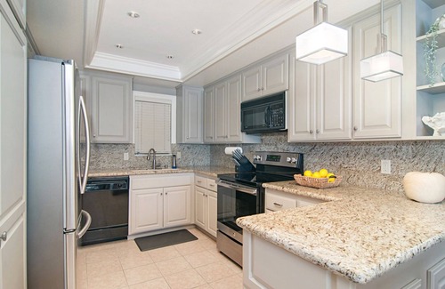 The expansive living room is open to the dining area and kitchen and its ocean views are surpassed only by those experienced on the balcony where you can also listen to the surf. The comfort of the balcony will call to you again and again. The living room includes a down filled sectional meant for relaxing, a flickering gas fireplace and a 60” Samsung Smart TV with Apple TV which allows you to view both premium cable channels and your own App programming, be it audio or video. There is also a desk area tucked into a recessed area next to the fireplace in the living room next to the sliding glass doors with an ocean view as well. The ocean view dining area easily accommodates 8 people and is just as enjoyable for two people. Like the living area, the dining area is meant for lingering. If you like to cook, you won’t be alone as the kitchen opens to the dining area and living room and, all while enjoying the ocean view.