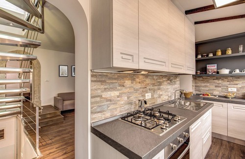 This is a breathtaking 90 squared meters apartment, nestled in the very heart of Rome! A beautiful flight of stairs opens on the lighty living room on which faces a fully furbished kitchen; cooking will never be this fun again, and the large windows and the amount of light coming through will have you thinking you're outdoors! A few steps away from the living room a large bedroom with a king size bed and a practical walk in closet; next to the bedroom a beautiful bathroom with a regular standing shower. As you walk up the beautiful stairs a second large bedroom, with a king size bed and an en suite bathroom. Steps away from the Vatican, Piazza Navona, the Pantheon and the Colosseum, this apartment will have you living Rome at its best!