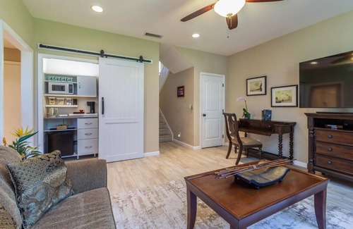 Welcome to Nihilani on Kauai's Lush North Shore. As a guest in this charming townhome, you will enjoy the privacy of two lovely lanais, two separate living areas (with a coffee bar/kitchenette in the downstairs living space), two bedrooms, two and a half baths, a two car garage and lots of beach gear including snorkel equipment, a surf board, kayak, boogie boards, stand up paddle boards, and bicycles. This comfy townhome is perfect for two couples traveling together, or a family with children who like to have their own space! You are steps away from restaurants, shops, groceries, golf, tennis, exercise equipment, and a walk/bike path that runs along the golf course with amazing views of the mountains, palm trees, and the beautiful blue ocean.