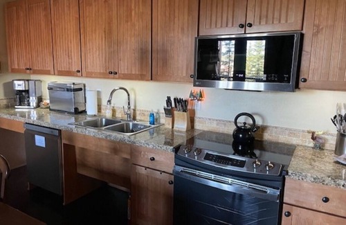Our property has everything you need for a relaxing vacation. Along with a list of contemporary luxuries, our condo features large living spaces with unobstructed views. It has a spacious, wonderfully decorated den with relaxing furniture, including a queen sleeper sofa with a memory foam mattress, stone surround romantic gas fireplace, and a large flat screen tv. The patio with a fabulous view has comfortable outdoor seating. The well-equipped kitchen has granite counter-tops and brand-new stainless-steel appliances. There is an electric cook-top, full oven, overhead microwave, dishwasher, beautiful cabinetry, and most everything you will need for your mountain vacation. The kitchen has a blender, crock pot, mixer, a drip coffee pot and a Keurig (guests are to bring their own coffee and pods), pans, utensils, and dishes to make meal preparation easy. You can even stop back in for lunch and be back on the mountain in no time. There is a large dining table that seats 6 for family meals or fun games. Also, there is a large entryway for all your coats, boots, hats and shoes. And on the same floor as the condo, your private ski locker is just a few steps along the corridor for easy storage, access to your equipment and a straight walk to the slopes. You will find a full luxury bathroom with large sink, storage, an oversized bath with an overhead bath shower and fluffy towels. The master bedroom is furnished with a luxury queen bed, cozy linens, bed side tables, a dresser, a large closet and a flat screen TV. No need to go to a laundromat, there is a full-size brand-new washer and dryer, iron and ironing board in the condo. Need to work during your stay? There is a convenient fold away desk with Internet and USB connections for your convenience. We also have 600 MB high speed wi-fi Internet. Limited pockets? No worries, we have digital access code door locks which eliminates the need for keys. Ceiling fans are located in the master bedroom and living room. And, don’t forget the convenience of the heated underground parking garage with a pass for ONE vehicle that has direct access to the complex without getting out onto the weather. Additionally, on-site you will find a hearth room with a dual sided stone fireplace and comfortable furnishings; a terrace with a fire pit and propane outdoor grills; a Porte-cochere for drive-up, drop off and pick up; elevator access to every floor; free (shared) WiFi in the Base Camp One Hearth Room and common areas; and the common areas are air-conditioned in summer months.