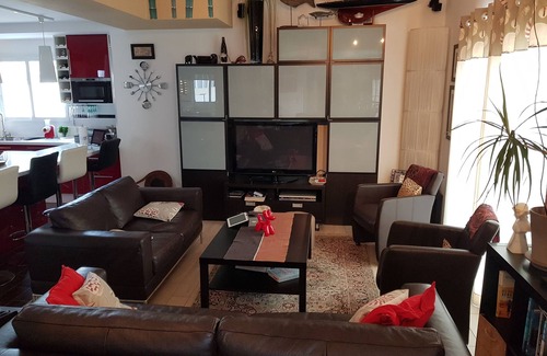 Living room of 50 m2 with large mezzanine, piano, guitar, 2 sitting areas, large screen LCD TV, library, office, dining bar open to contemporary lacquer kitchen.