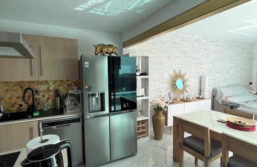 The open plan kitchen, dinning and living space visually connects with the exterior through large openable patio doors. A smart TV, fast WI-FI throughout the Villa and well resourced kitchen with American fridge allow for a comfortable and convenient stay. Downstairs, you will further find a large storage area and a sower with a WC. Towels and basic toiletries are provided throughout. We also provide a very comfortable sofa bed with an integrated mattress to accommodate more sleepers :) The electronic blinds operate on a motor and be controlled individually or altogether, they help control solar glare|gain without compromising all your view.