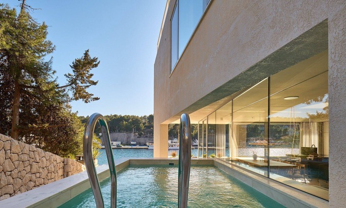 Luxury Villa Ellipse with Pool is nestled just a few meters from the sea, with a beautiful view of the bay in the town of Milna on Brac.