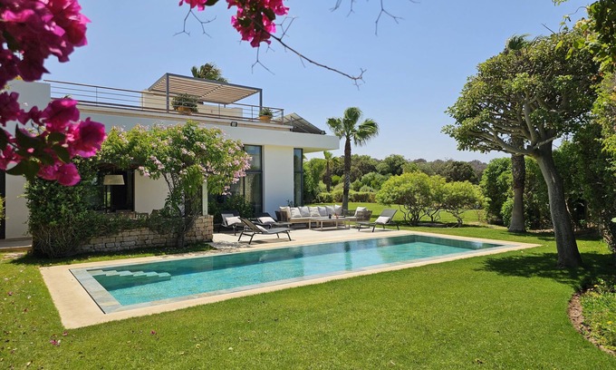 Modern, stylish villa located in a recent golf complex, next to the beach in Essaouira. The villa has 3 spacious bedrooms, 2 bathrooms, a large and fully equpped kitchen, a stylish living room and inside and outside dining rooms. There is a heated swimming pool and terrace with sun loungers and comfy lounge furniture and a large upstairs terrace perfect for relaxing and watching the sunsets. The villa benefits from air conditioning, contemporary furniture, 24 hour security, international TV, unlimited wifi, a safe, and 3 parking spaces.