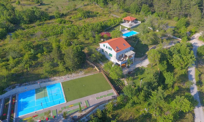 Villa offers all that guests need for nice , relaxed and very private vacation in forest environment of middle Dalmatia . All big cities in region ( Split, Šibenik , Kastela , Omiš , Trogir ... ) or rivers ( Krka , Cetina) are in 30 to 60 min drive , so guests can see all of them during the day rush and still have their own private luxury place for relaxation with family and friends by the large pool or in our "konoba".