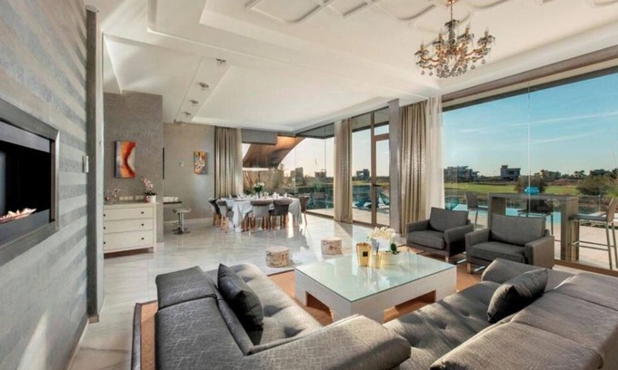 Luxury Villa Illy d'architecte moderne and confortable with vieaw on golf and mountain Atlas. Luxury Salon and diner table with view on the pool and the garden. At 5 minutes from the souk of Marrakech by car or taxi. Dining area and full equiped kitchen. With 9 suites confortables on suit bath room each. Hammam with shower and massage room. Cinéma room and fitness room ! Only for families group and quiet groups. Villa only for families No music or guests or prostitues En extra charge : Electricity, meals, shooping delivery , house keeper, chef ...