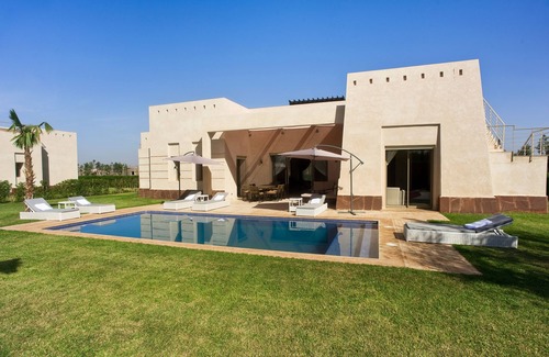 The villa has a favourable location, 30 min away from the airport, 15 km away from Marrakesh and 10 min away from the larger golf courses on the road to Fès. Apple Gardens is a gated secure resort in the heart of the countryside. Designed by one of the most prestigious architect of Morocco, it's a new villa built in an approximately 1000-sq. m land. Its 150-sq. m habitable consists in: 3 suites with shower and toilet, equipped kitchen, an European style living room with a TV, a Moroccan living room, a dining room, an outdoor lounge and dining room, deck chairs and private pool that could be reheated for € 30 per day. On the 50-sq. m terrace, you will have a view of the Atlas Mountains. Free Wi-Fi Internet access and air-conditioning unit. Furnished by a young Moroccan architect, the villa Marrakchi offers all the comforts that you are looking for to spend enjoyable holidays.