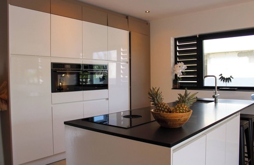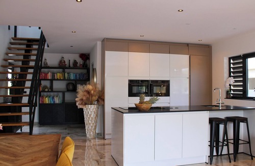 The spacious living room is located on the ground floor. This has large sliding doors at the rear so that the wind blows wonderfully through the house. Luxurious, fully equipped kitchen with a cooking island.