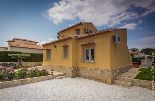 This well maintained villa with heated private pool is located in a nice quiet area outside of Denia and it is only a short walk to the beach. The residential area close to the sea and the very beautiful garden with palm trees, oleanders and many Mediterranean plants, cozy seating areas and atmospheric lighting leave nothing to be desired. Specifically, the villa has a large living-dining room with an open fireplace (for cozy warmth during the winter months), 2 cozy bedrooms on the ground floor, a fitted kitchen with all the extras and a bathroom with a whirlpool. In the separately accessible tower apartment, the 3rd Bedroom and another bathroom. The villa has been completely renovated.